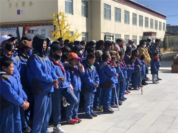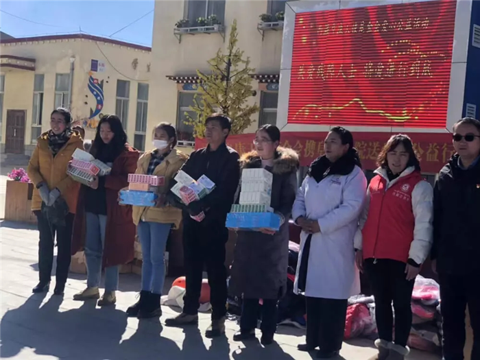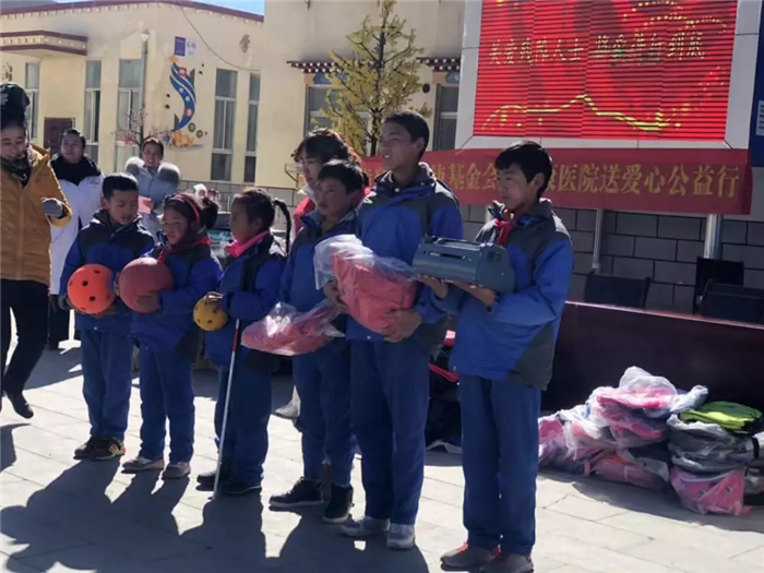 11月1日上午,西藏阜康天使基金會吉拉女士受西藏阜康醫(yī)療股份有限公司黨委書記、阜康天使基金會會長王斌先生,西藏阜康醫(yī)療股份有限公司總經理、阜康天使基金會秘書長劉瀟瀟女士委托與西藏阜康醫(yī)院義診隊一起,攜價值一萬五千元的藥品和兩萬元的物資來到那曲市特殊教育學校,為這里的孩子們帶來了文化體育學習用品及藥品等物資。在特校校長次仁拉姆的組織下,特校師生列隊歡迎我們的到來,還精心準備了錦旗和潔白的哈達。