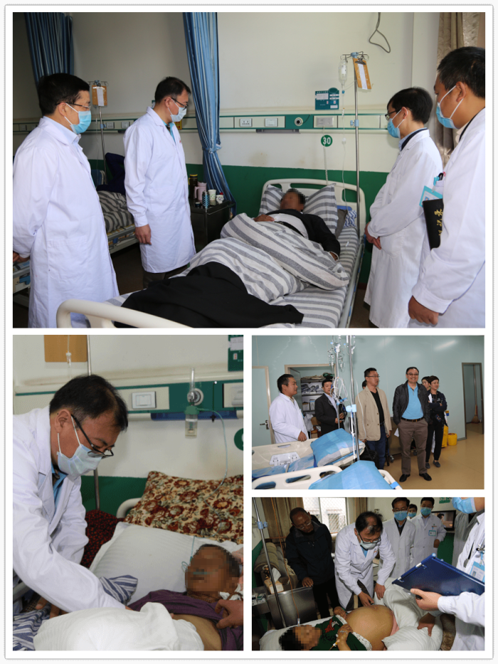 在阜康醫(yī)院住院部,周平紅教授一行換上工作服和阜康醫(yī)院消化內(nèi)科醫(yī)護(hù)人員一起查房。在44號尼珍的病床前,周平紅教授詳細(xì)詢問病人的生理、病理指標(biāo),阜康醫(yī)院醫(yī)護(hù)人員一一詳細(xì)回答。之后,周平紅教授走到病床前對患者的體征狀況進(jìn)行了仔細(xì)檢查,并向家屬詢問病人的實(shí)時病況。周平紅教授還來到89歲的患者扎西、離退休人員格桑的病床前,詢問了病人的各項指標(biāo)并仔細(xì)進(jìn)行了體征檢查。