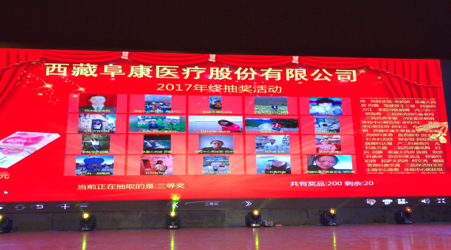 抽獎環(huán)節(jié)更是讓年會進入高潮,帶動了全場同仁,1000多張個人照在大屏幕上不停滾動著,隨著一聲聲地叫停,畫面一幕幕定格,一批又一批幸運兒誕生了,歡呼聲、笑聲、掌聲、吶喊聲此起彼伏,匯成歡樂的海洋,為獲獎?wù)咦8?,為自己祝福,為阜康來年會更好而祝福!剛參加?拉薩市政協(xié)會議”的陳彬副總經(jīng)理也在第一時間趕到現(xiàn)場與大家聯(lián)歡,并為大家抽取今天的一等獎,大家翹首以盼,現(xiàn)場氣氛頓時沸騰起來。本次共抽出三等獎200名,二等獎50名,一等獎20名。