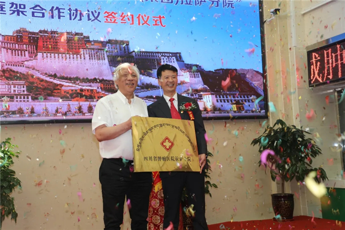 四川省腫瘤醫(yī)院黨委書記郎錦義,西藏阜康醫(yī)療股份有限公司黨委書記、董事長(zhǎng)王斌代表雙方共同簽署《川藏區(qū)域共建四川省腫瘤醫(yī)院(集團(tuán))拉薩分院戰(zhàn)略框架合作協(xié)議》,隨后郎錦義書記向王斌董事長(zhǎng)進(jìn)行了授牌。