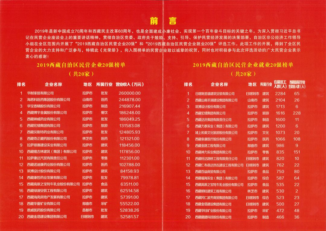 為表彰先進,樹立典型,西藏自治區(qū)工商聯(總商會)決定授予20家民營企業(yè)"2019西藏自治區(qū)民營企業(yè)20強”稱號,授予20家民營企業(yè)"2019西藏自治區(qū)民營企業(yè)就業(yè)20強”稱號。