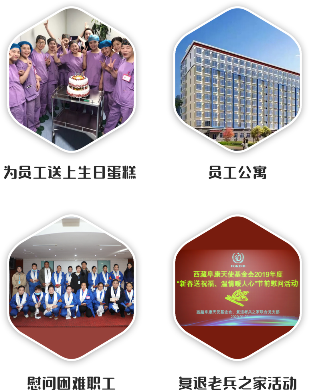 阜康醫(yī)療始終堅持"以人為本”,高度關注員工工作生活,采取有效措施為員工排憂解難。公司積極協調員工的住宿問題,解決了大部分員工的住宿問題;公司職工"五險一金”參保率100%;為困難員工及家屬減免醫(yī)療費用;為員工免費提供一日三餐;接送城關區(qū)員工子女上下學;建立了"退伍老兵之家”、"黨員活動室”;每年三大節(jié)日期間,公司黨委深入困難職工家庭慰問;建立為員工送上生日蛋糕并為其父母寄300元慰問金的制度。廣大員工切身感受到了公司的關懷和溫暖。